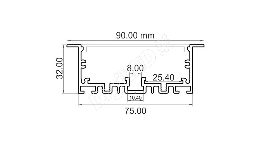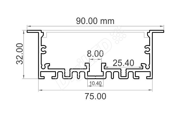 | Aluminum | 90 mm x 32 mm | 25mm x 2 rows | 2400 mm | Press fit [optional] | 60w | Raw/anodized or Powder coated |