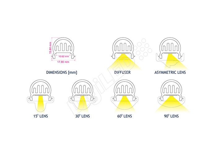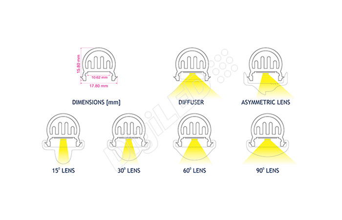 | Material | Size | Max PCB size possible | Max length | Diffuser | Recommended watts/meter | Finish |