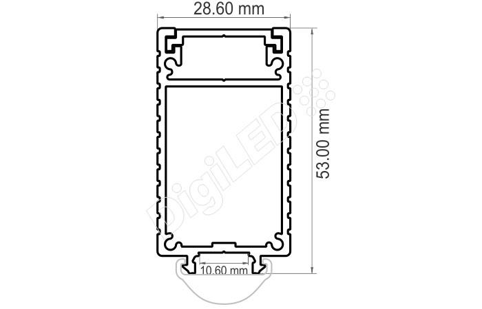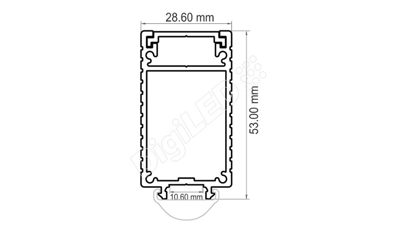 | Aluminum | 28.60mm x 53mm | 10mm | 2500 mm | Press fit [optional] | 20-25w | Raw/anodized or Powder coated |