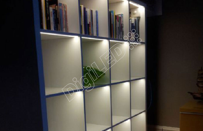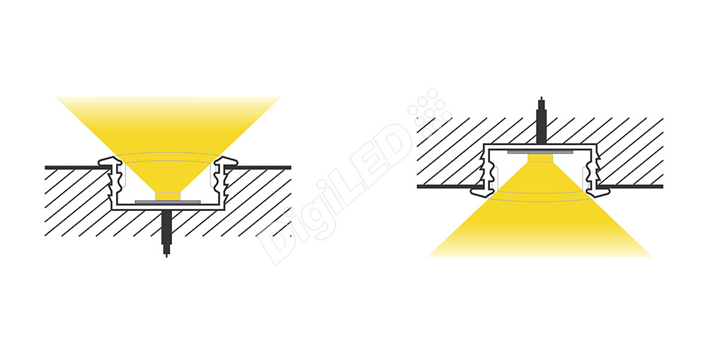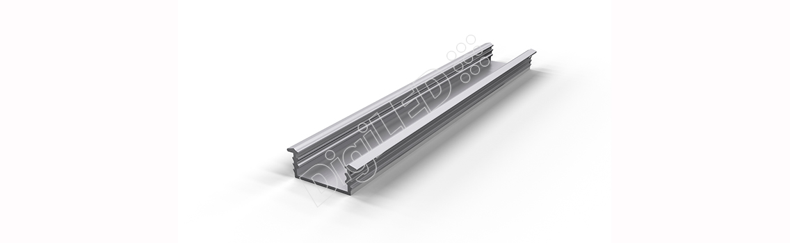 Recessed type of aluminum LED profi¬le; dedicated for build-in into material as MDF or other. The profi¬le can be also recessed into floor; wall or ceiling and the wide edges of the profi¬le will cover the edges of insertion row completely. Frosted/milky or clear diffusers will help to deliver soft smooth light on the whole surface. This type of profile is often use for build in underneath kitchen cabinets led lighting, retail store shelf lighting and many other applications. It’s especially design teeth’s enables it to remain fixed in the groves without any special efforts or arrangements.