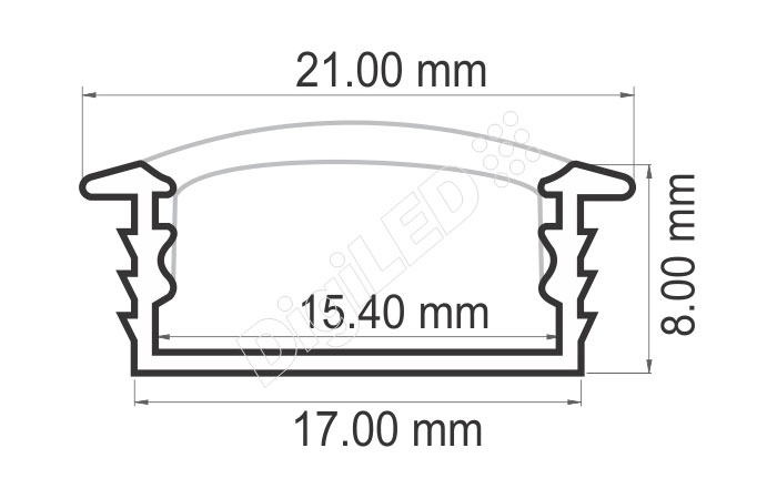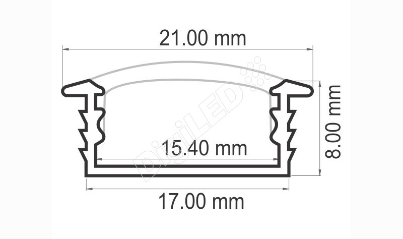 | Aluminum | 21 mm x 8 mm | 15mm | 2000 mm | Press fit [optional] | 15w | Raw/anodized |