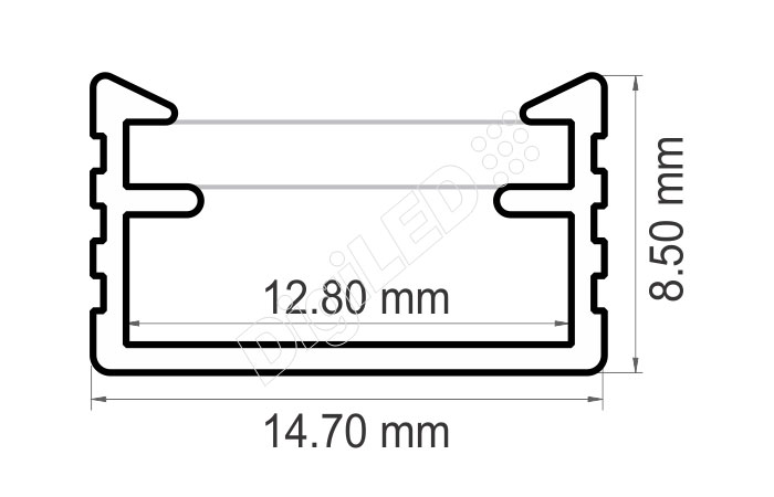 | Aluminum | 12.80 mm x 8.50 mm | 12mm | 2000 mm | Slide-in [optional] | 15w | Raw/anodized |
