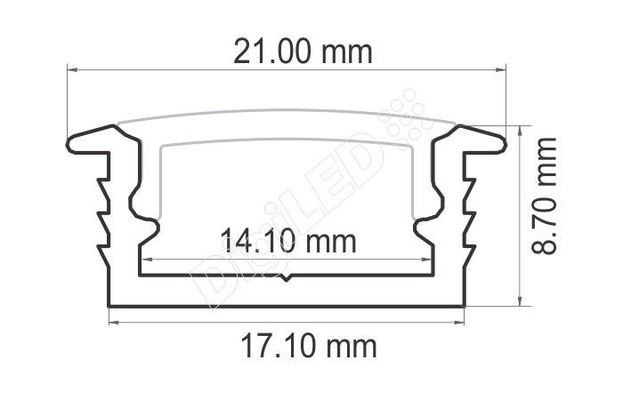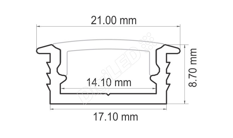 | Aluminum | 21 mm x 8.70 mm | 12mm | 2000 mm | Press fit [optional] | 20w | Raw/anodized or Powder coated |