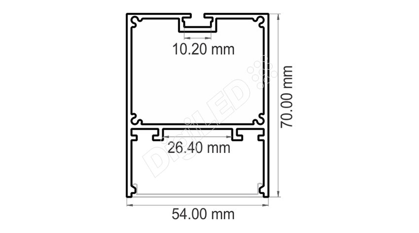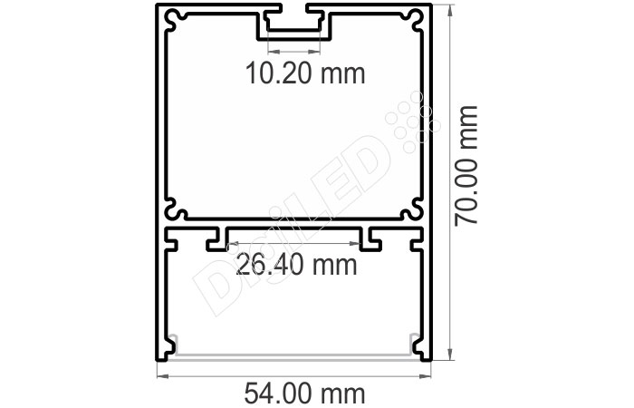 | Aluminum | 54mm x 70mm | 26mm | 2400 mm | Press fit Satin | 40w | Raw/anodized or Power Coated |