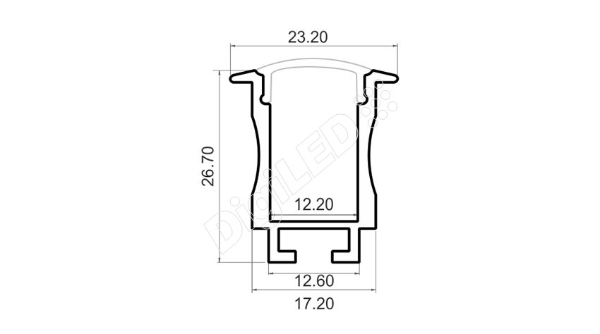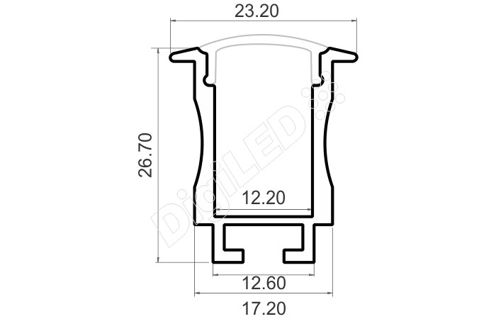 | Aluminum | 26.70 mm x 23.20 mm | Up to 12mm | 2000 mm | Press fit [optional] | 4 - 20w max | Raw/anodized or Powder coated |
