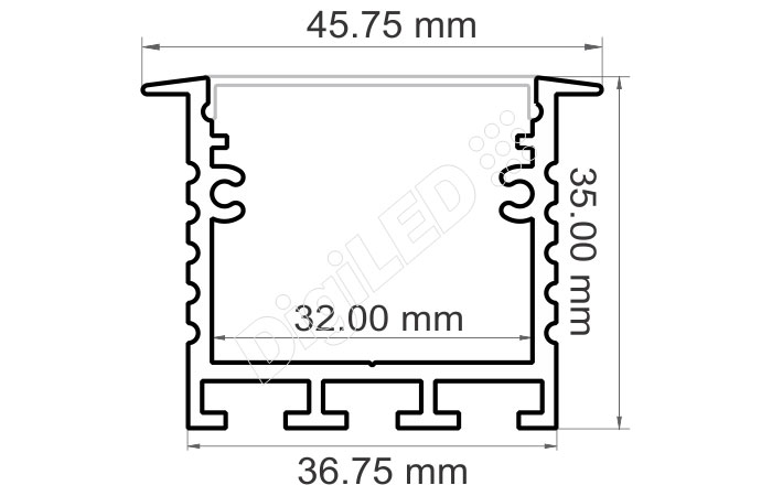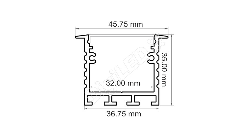 | Aluminum | 45.75 mm x 35 mm | Up to 30mm | 2500 mm | Press fit [optional] | 15 - 25w max | Raw/anodized or Powder coated |